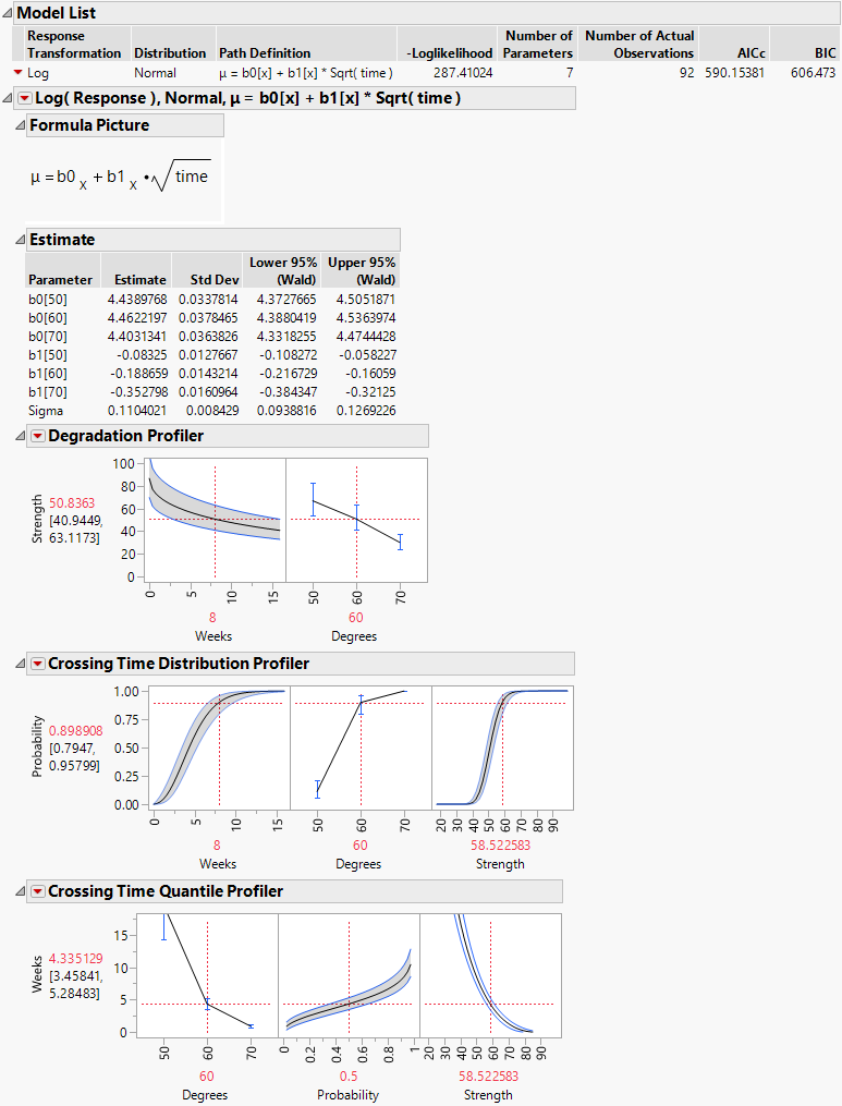 This example of an accelerated destructive degradation model is patterned after an example from Escobar et al. (2003). The data consist of measurements on the strength (measured in newtons) of an adhesive bond. Temperature is considered to be an acceleration factor. The product is stressed until the bond breaks and the required breaking stress is recorded. Because units at normal use conditions are unlikely to break, the units were tested at several levels over a wide range of temperatures. Strength less than 50 newtons is considered failure. You want to estimate the proportion of units with a strength below 50 newtons after 260 weeks (5 years) at use conditions of 35 degrees Celsius.