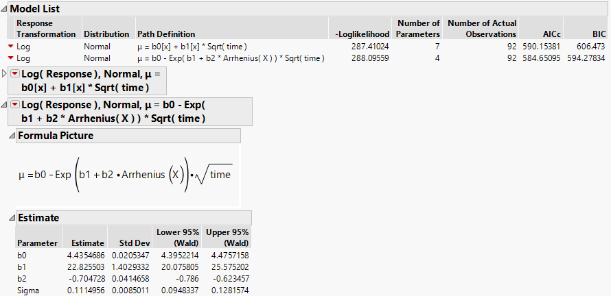 Because the Arrhenius model shows a better fit, as indicated by its smaller AICc and BIC values (Figure 7.6), you continue your analysis using this model.