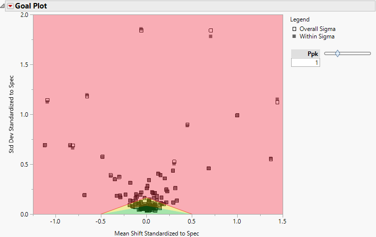 The Goal Plot shows, for each variable, the spec-normalized mean shift on the x-axis, and the spec-normalized standard deviation on the y-axis. It is useful for getting a quick, summary view of how the variables are conforming to specification limits. By default, the Goal Plot shows only those points for each column that are calculated using the overall sigma. Hold your cursor over each point to view the variable name and the sigma method used to calculate the point. See Goal Plot for details about the calculation of the coordinates for the Goal Plot.