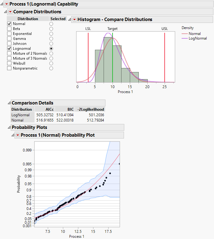 Figure 10.16 shows the Compare Distributions report for Process 1 in the Process Measurements.jmp sample data table. The Selected distribution, which is Lognormal, is being compared to a Normal distribution. The Comparison Details report shows fit statistics for both distributions.