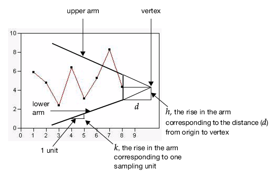 To interpret a two-sided CUSUM chart, compare the points with limits that compose a V-mask. A V-mask is a shape in the form of a V on its side that is superimposed on the graph of the cumulative sums. The V-mask is formed by plotting V-shaped limits. The origin of a V-mask is the most recently plotted point, and the arms extended backward on the x-axis, as in Figure 5.6. As data are collected, the cumulative sum sequence is updated and the origin is relocated at the newest point.