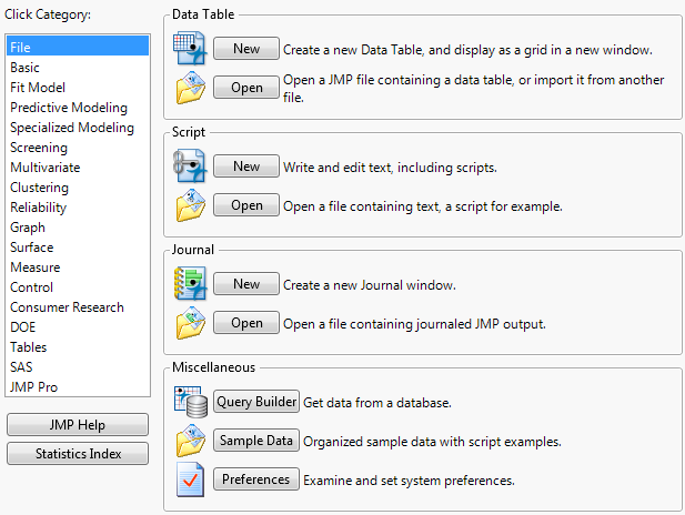 To display the JMP Starter automatically when you open JMP on Windows, select File > Preferences > General, and then select JMP Starter from the Initial JMP Window list. On Macintosh, select this option on the JMP > Preferences > General page.