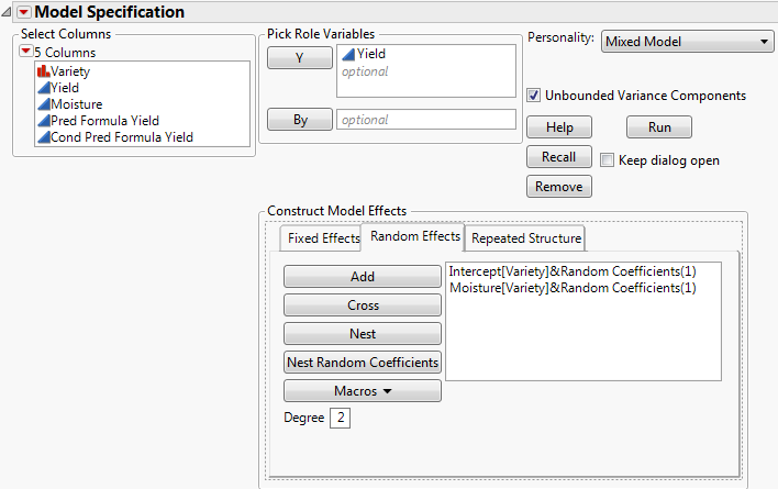 Random coefficients are modeled using an unstructured covariance structure. Figure 7.9 shows the random coefficients specification for the Wheat.jmp sample data. (See also Example Using Mixed Model.)
