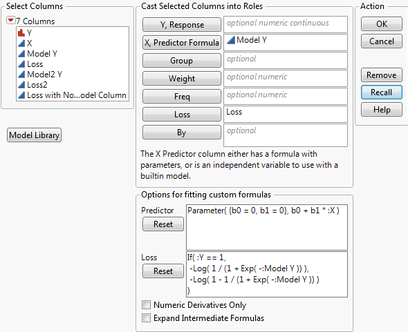 Tells JMP that if an ingredient column to the model is a column that itself has a formula, to substitute the inner formula, as long as it refers to other columns. To prevent an ingredient column from expanding, use the Other column property with a name of “Expand Formula” and a value of 0. This option is used only when a formula column is provided in the X, Predictor Formula role.