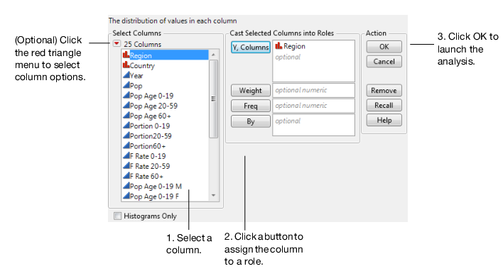 The launch window is your point of entry into a platform, where you specify the columns to analyze. Figure 1.11 shows the Distribution launch window.