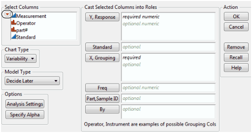 Moves selected columns into roles (such as Y, X, and so on.) You cast a column into the role of a variable (like an actor is cast into a role). See Cast Selected Columns into Roles Buttons.