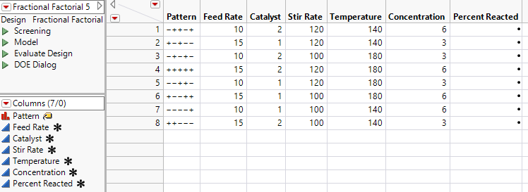 If the design was selected from the Design List, the design table contains a Pattern column. The Pattern column contains entries that summarize the run in the given row. Low settings are denoted by “–”, high settings by “+”, and center points by “0”. Pattern can be useful as a label variable in plots.