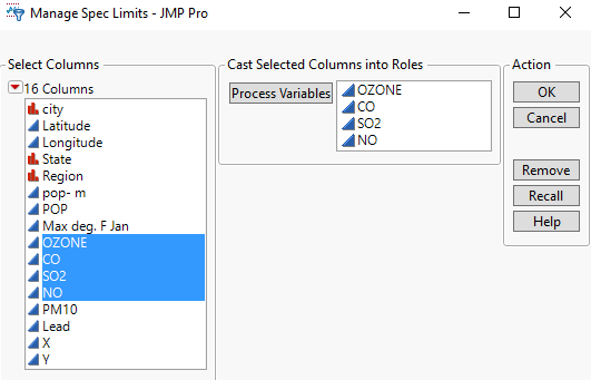 Specify the columns you want to set specification limits on. For this example, select OZONE, CO, SO2, and NO, and click Process Variables.