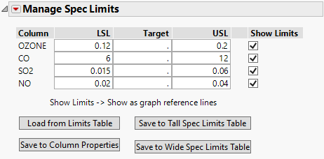 Specification limits for all columns will appear in graphs for any future analyses. If you want to show the specification limits only for individual columns, check the Show Limits box next to those columns.