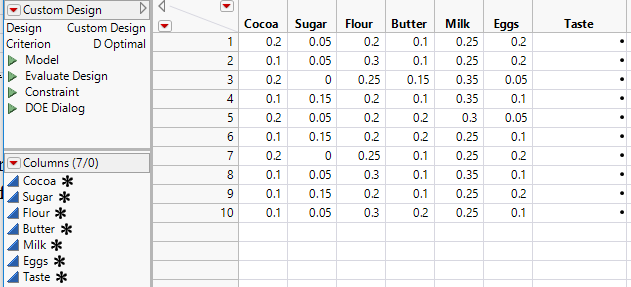 The settings for the dry ingredients, Cocoa, Sugar, and Flour, sum to 45% of the mixture and the settings for the wet ingredients, Butter, Milk, and Eggs, sum to 55% of the mixture. The settings also conform to the upper and lower limits given in the Factors outline.