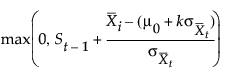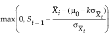 t = 1, 2,..., n, where S0 = 0, zt is defined as for two-sided charts, and the parameter k, termed the reference value, is positive. If the parameter k is not specified in the launch window, k is set to δ/2. The CUSUM St is referred to as an upper cumulative sum. St can be computed as follows: