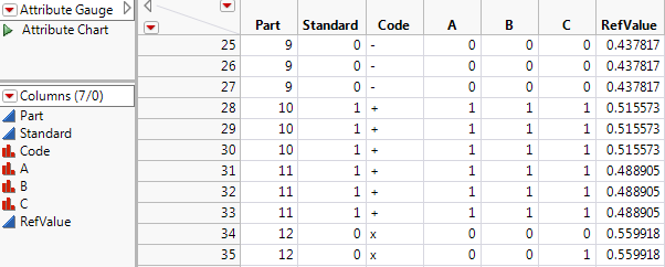 Any other variables of interest that you might want to use as X, Grouping variables should appear stacked in one column each (see the Part column in Figure 9.2). You can also define a Standard column, which produces reports that compare raters with the standard. The Standard column and response columns must have the same data type.
