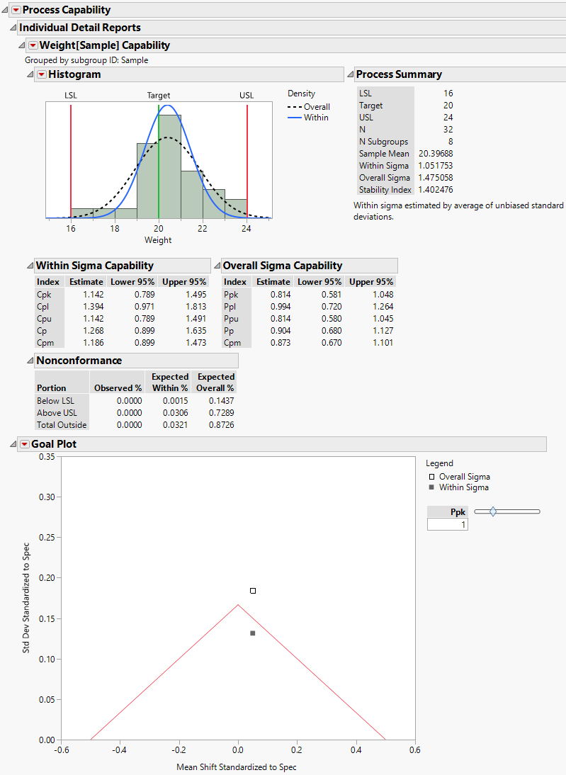 However, the point calculated using Within Sigma is inside the goal triangle. This indicates that, if the process were stable, Weight values would have a high probability of falling within the specification limits.
