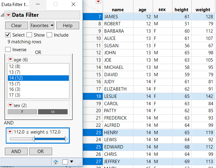 age and sex are in the same group. In the data table, rows that meet either the age OR sex conditions are selected. That is, all 14-year-olds and all males are selected in the data table.
