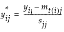 Using notation, for an observation i in group t, the group-centered and scaled value for the jth covariate is: