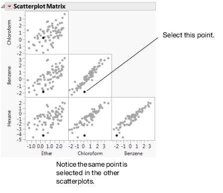 For example, if you select a point in the Benzene versus Chloroform scatterplot, the same point is selected in the other five plots.