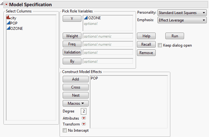 Open Polycity.jmp. You are interested in the relationship between POP, the population in thousands of the given city, and Ozone. Ozone is the response of interest, and POP is the continuous model effect.