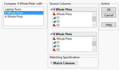 Open the Matching Specification outline under Reference Design: 20 run ‘4 Whole Plots’.
