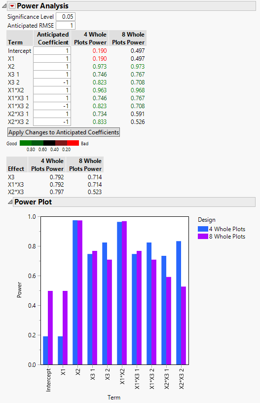 The Power Analysis report shows that the power for the whole-plot factor, X1, is much smaller for the four whole-plot design (0.19) than for the eight whole-plot design (0.497). However, the four whole-plot design has higher power to detect split-plot effects, especially the interaction of the two split-plot factors, X2*X3 (0.797 compared to 0.523). Notice that the power for the combined effect X2*X3 is given under the color bar and legend.