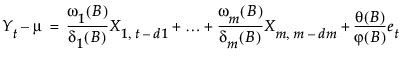 ωk(B) and δk(B) represent numerator and denominator factors (or polynomials) for individual transfer functions, with k representing an index for the 1 to m individual inputs.