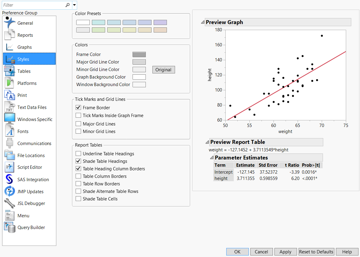 The Style pages enables you to customize colors, tick marks and grid lines, and report colors.
