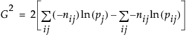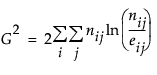 The Likelihood Ratio Chi-square test statistic is computed as twice the negative log-likelihood for Model in the Tests table. Some books use the notation G2 for this statistic. The difference of two negative log-likelihoods, one with whole-population response probabilities and one with each-population response rates, is written as follows: