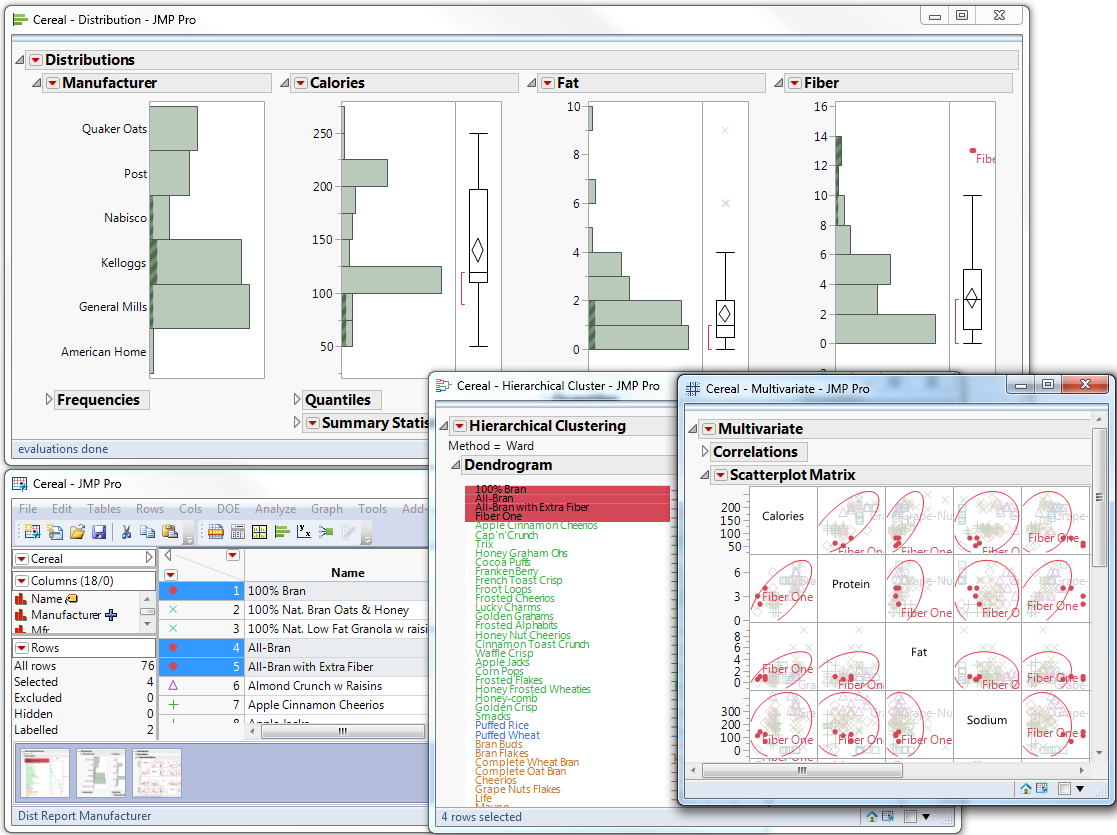 This chapter steps through an analysis of the Cereal.jmp sample data table that is installed with JMP. You learn how to explore the data in the Distribution, Multivariate, and Hierarchical Clustering platforms.