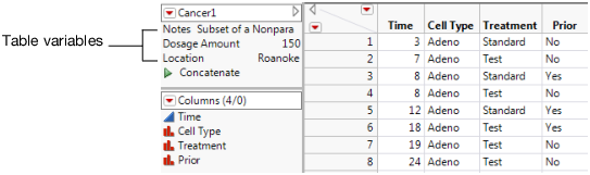 Table variables are used primarily to document tables. Many sample data tables installed with JMP contain a table variable named Notes. This variable provides details about the data (for example, the source of the data). The example in Figure 3.49 shows a data table that contains Notes as one of its table variables. JMP also automatically creates table variables when you create a design table using the Design of Experiments commands in JMP. The design table has a table variable named Design with the name of the design type as its value.