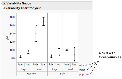 This example uses the Popcorn.jmp data table with data from a popcorn maker. The yield (the volume of popcorn for a given measure of kernels) was measured for each combination of popcorn style, batch size, and amount of oil used.