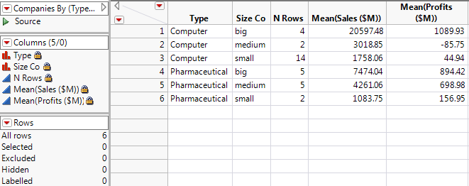 The N Rows column shows the number of rows from the original table that correspond to each combination of grouping variables. For example, the original data table contains 14 rows corresponding to small computer companies.