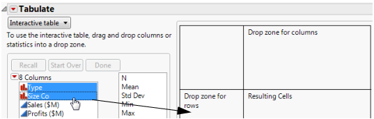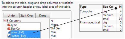 JMP calculates the mean of Sales ($M) and the mean of Profit ($M) for each combination of Type and Size Co.