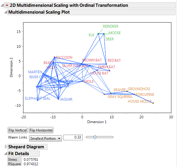 There is a list from which you can choose to show the Smallest Portion or the Largest Portion of links on the plot. The portion of links shown is controlled by entering a value in the box or by using the slider. Figure 8.5 shows Waern links for the Teeth.jmp data table for the 33% smallest portion.