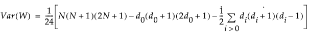 Under the null hypothesis, the mean of W is zero. The variance of W is given by the following: