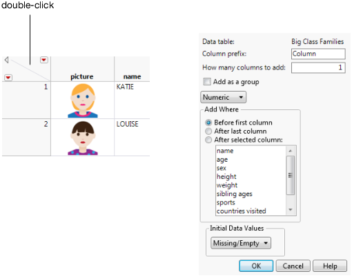 Double-click the empty space to the right of the last data table column to add one column. See About the Column Info Window for details about changing attributes after you add the column.