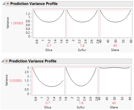 For both designs, the profilers identify the same point as one of the design points where the maximum prediction variance occurs: Silica=0.7, Sulfur=1.8, and Silane=40. The maximum prediction variance is 1.396 for the intended design, and 3.021 for the actual design. Note that there are other points where the prediction variance is maximized. The larger maximum prediction variance for the actual design means that predictions in parts of the design space are less accurate than they would have been had the intended design been conducted.