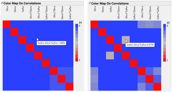 The absolute values of the correlations range from 0 (blue) to 1 (red). Hover over a cell to see the value of the absolute correlation. The color map for the actual design shows more absolute correlations that are large than does the color map for the intended design. For example, the correlation between Sulfur and Silica*Sulfur is < .0001 for the intended design, and 0.5774 for the actual design.