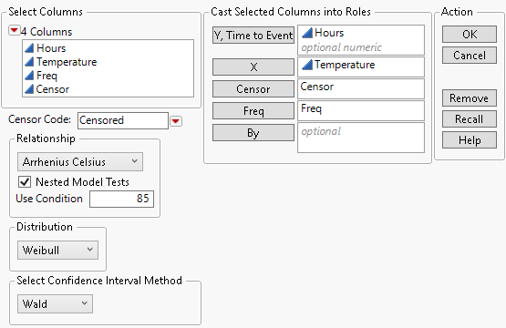 This example uses Capacitor ALT.jmp and can be found in the Reliability folder of the sample data. It contains simulated data that gives censored observations for three levels of temperature, for a reliability study. Observations are shown as censored values at temperature levels of 85, 105, and 125 degrees Celsius.