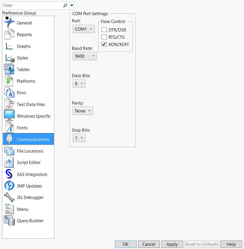 (Windows only) Communications preferences customize settings for reading data from an external source. These settings need to be specified only if you are using an instrument to do so.