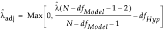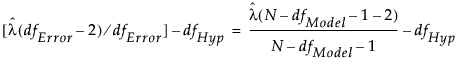 The expression on the right illustrates the calculation of the unbiased noncentrality parameter when a sample size N, different from the study size n, is proposed for a retrospective power analysis. Here, dfHyp represents the degrees of freedom for the hypothesis and dfModel represents the degrees of freedom for the whole model.