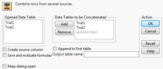 When you concatenate data tables in JMP, you combine rows from two or more data tables. You can create a new data table or you can append rows to the first data table. A column name might be the same in the data tables that you want to concatenate. If so, then the column in the new data table lists the values from all of the data tables in the order of concatenation. If the two original data tables have columns with different names, those columns are included in the new data table showing missing values.