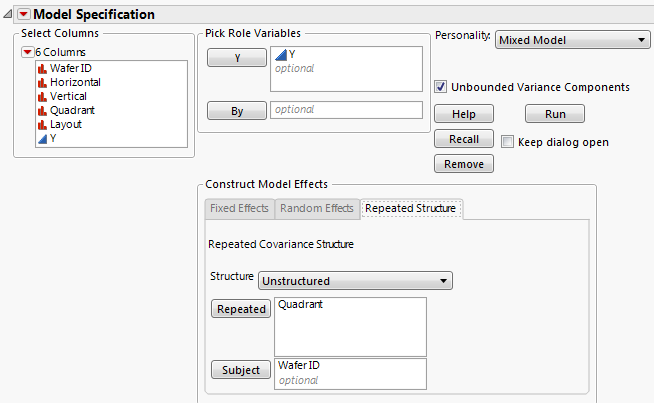 Since there is a Model script in the data table, the Model Specification window is already filled in. Note that the columns High, High through Low, Low are entered as Y and that Layout is the single model effect.