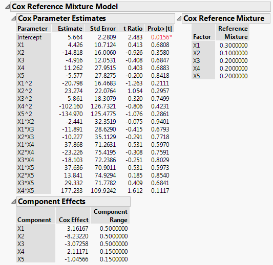 Standard least squares fits mixture models using the parameterization suggested in Scheffé (1958). The parameters for this model cannot easily be used to judge the effects of the mixture components. The Cox Mixture model is a reparameterized and constrained version of the Scheffé model. Using its parameter estimates, you can derive factor effects and the response surface shape relative to a reference point in the design space. See Cornell (1990) for a complete discussion.