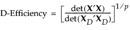 Let X denote the design, or model, matrix for a given assumed model with p parameters. For the definition of the model matrix, see Simulate Responses. Let XD denote the model matrix for a D-optimal design for the assumed model. Then the D-efficiency of the design given by X is as follows: