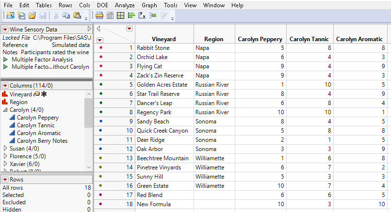 The data table rows represent the items that are being measured. Observations for each item must be in a single row. For example, Figure 7.5 shows a table that is measuring attributes of 16 wines from different vineyards. The column panel shows the column groups, or sub-tables, for each panelist. The Vineyards in rows 17 and 18 are not assigned a Region. The analysis could be used to explore which region the vineyards are most aligned to.