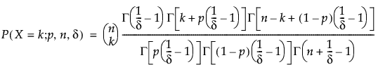 The beta binomial distribution results from assuming that X|π follows a Binomial(n,π) distribution and π follows a Beta(p(1-δ)/δ,(1-p)(1-δ)/δ) distribution. It is useful when the data are a combination of several Binomial distributions that each have different probabilities of success. For more information, see Distributions topic in the Basic Analysis book.