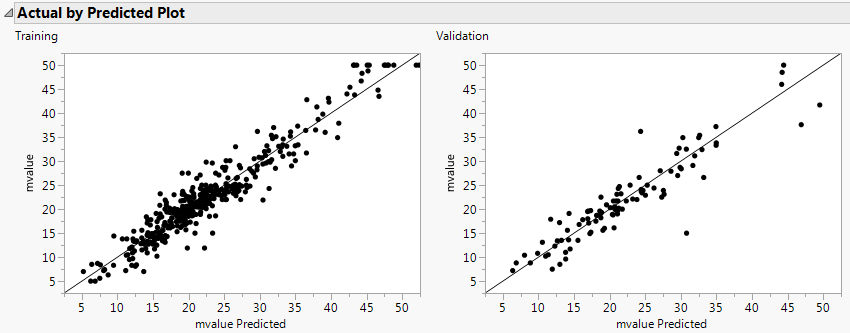 The R-Square statistic for the Validation set is 0.913, signifying that the model is predicting well on data not used to train the model. As an additional assessment of model fit, select Plot Actual by Predicted from the Model red-triangle menu. The plot is shown in Figure 4.7.