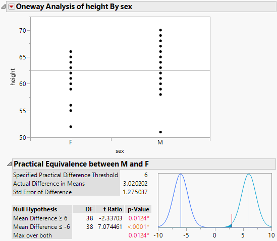 This example uses the Big Class.jmp sample data table. Examine if the difference in height between males and females is less than 6 inches.