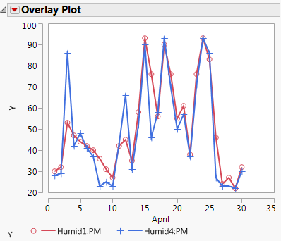 To help you quickly differentiate between the Ys, select Y Options > Connect Points from the Overlay Plot red triangle menu. Adjacent points are connected for each Y variable, as shown in Figure 5.3.