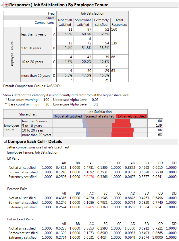 The p-values for pairwise Pearson Chi-square, likelihood ratio chi-square, and Fisher’s exact tests for independence are provided in tables. The tables are labeled by comparison letters. The comparison letters are shown in the Crosstab table to the right of the group labels. Response rates that differ by groups are indicated with a comparison letter in the Crosstab table cells.