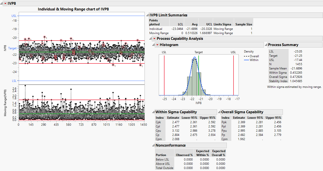 A Control Chart Builder report appears. Because IVP8 has a Spec Limits column property, the report also includes a capability analysis.